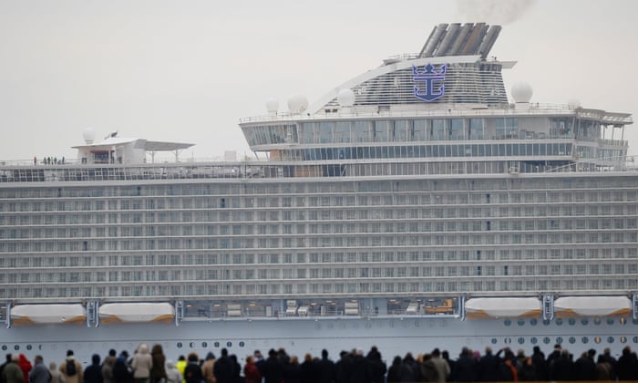 | Harmony of the Seas, the world’s largest cruise ship. Some 2,000 crew are to cater for the needs of more than 6,000 passengers on Harmony, which is a metre wider than the current twin ocean-going monsters of the pleasure cruise world Source:http://www.theguardian.com/world/2016/mar/11/world-largest-cruise-ship-harmony-of-the-seas-sets-sail-first-sea-trial |